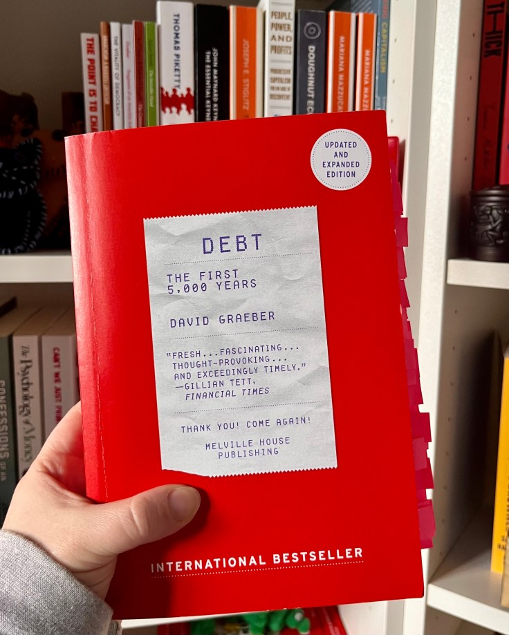 This is the third book from Graeber I’ve read, and what I always love about his writing is that he doesn’t take anything for granted. He will challenge everything and force you to reconsider why you think the things you do and what the basis for your beliefs are. He’s like that crotchety uncle at Thanksgiving who won’t just let you make a point and will question everything you say in a way that makes you think more critically. As annoying as that can be, I think we all need one of those (at least sparingly), especially when it comes to discussing subjects with such wide-ranging implications as debt.